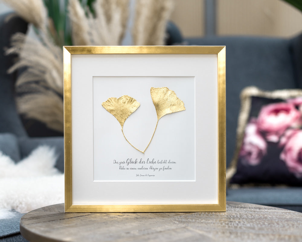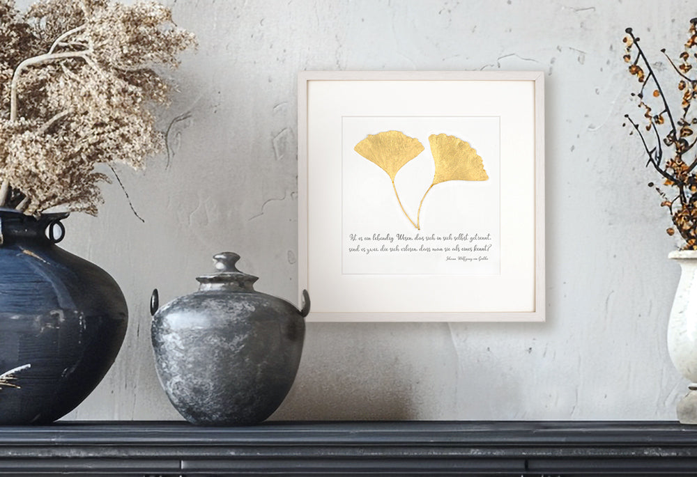 Poetische Spruchbilder mit vergoldeten Klee-/Ginkgoblättern