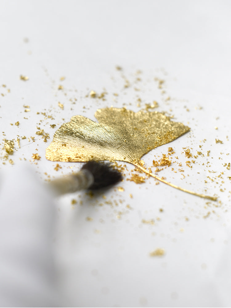 Das hauchdünne Blattgold (1/10.000 mm) wird mit einem speziellen Pinsel, dem sogenannten Anschießer aus Fehhaar, auf das Ginkgoblatt aufgelegt. -