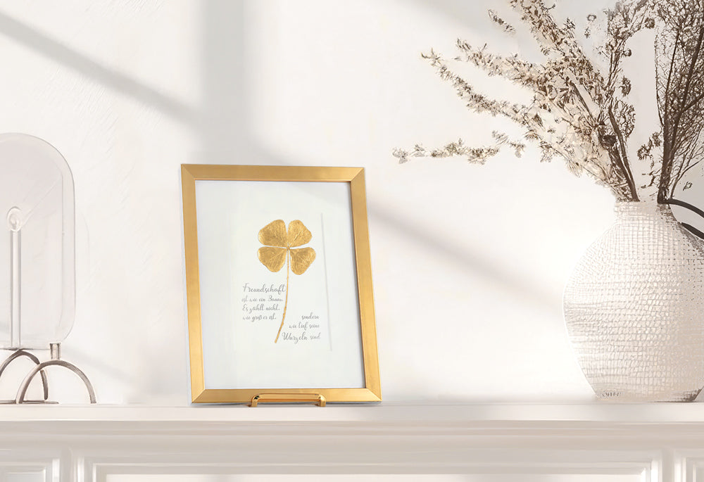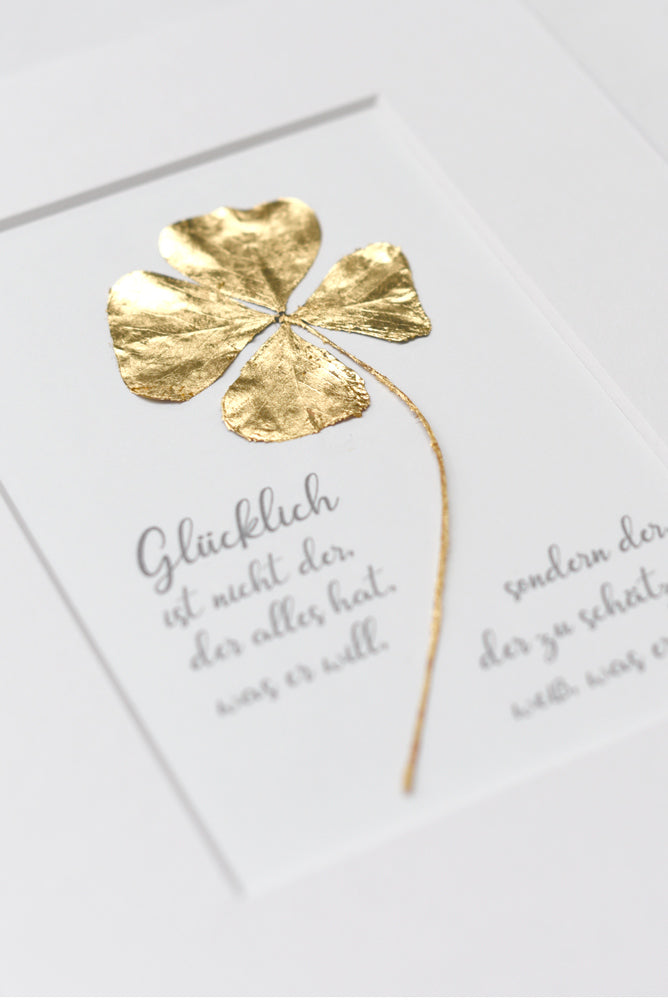 Vergoldete vierblättrige Kleeblätter mit Spruch