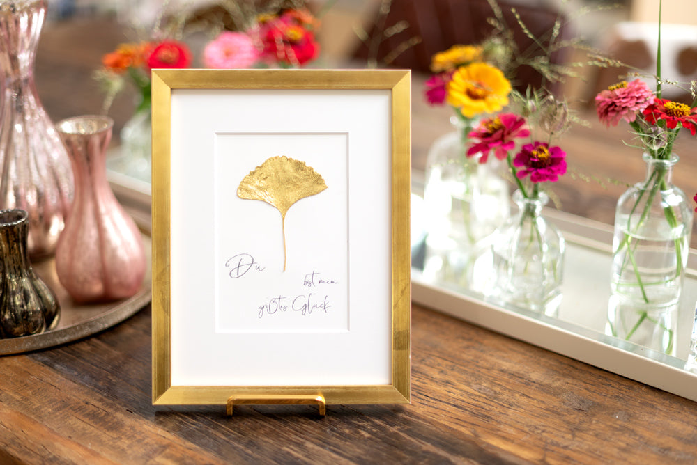 Originelle Geschenkidee, Vergoldetes Ginkgoblatt, Echtgold Ginkgoblatt, Ginkgoblatt Gold, Goldenes Glück - Poetische Spruchbilder