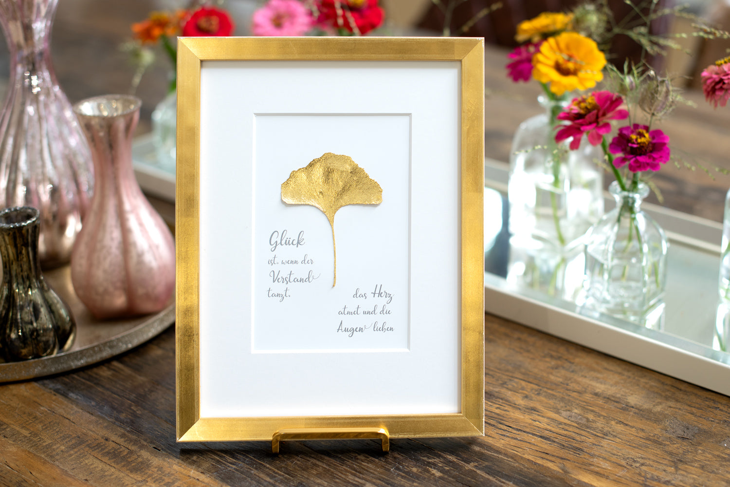 Originelle Geschenkidee, Vergoldetes Ginkgoblatt, Echtgold Ginkgoblatt, Ginkgoblatt Gold, Goldenes Glück - Poetische Spruchbilder